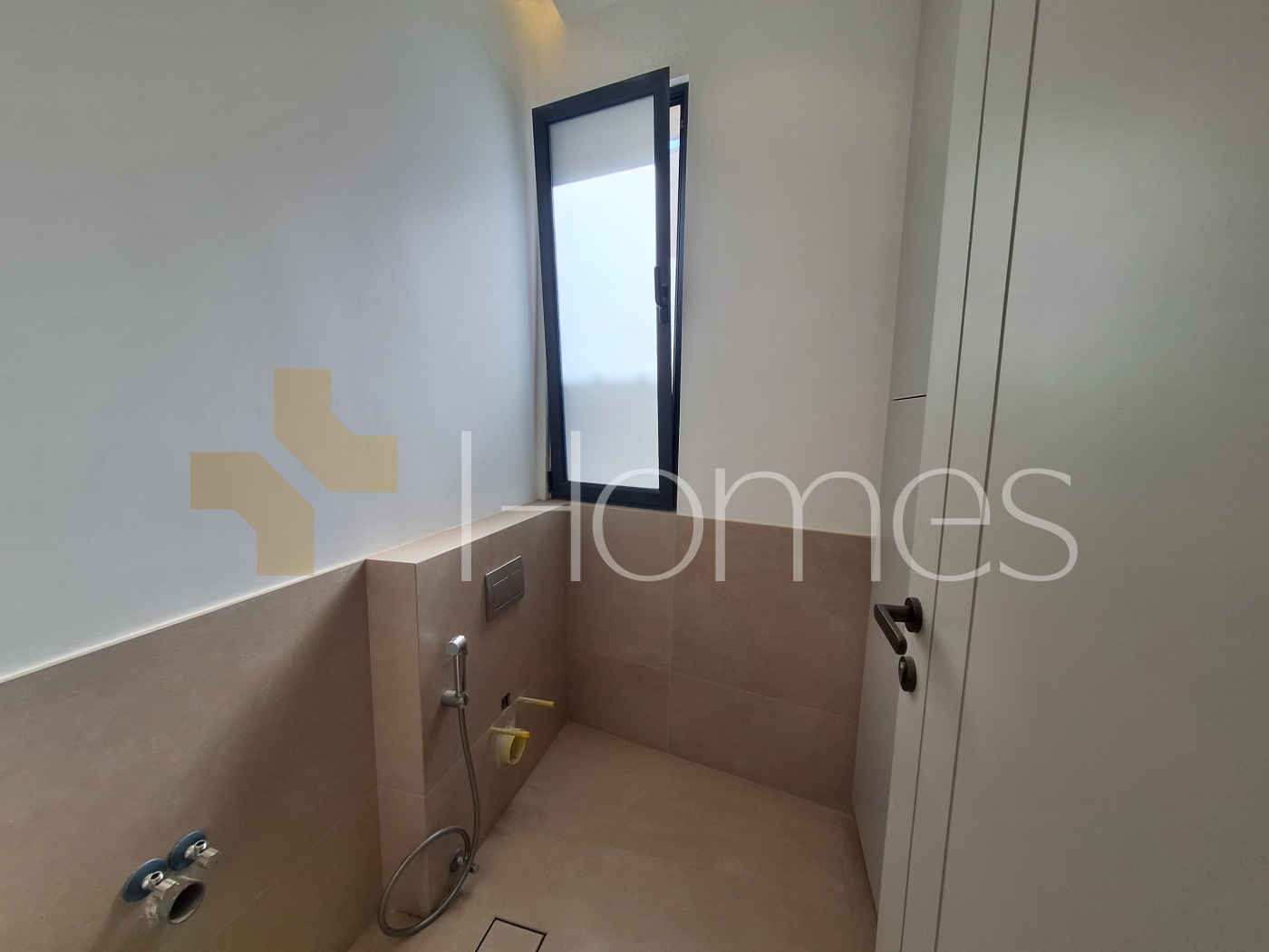 ارضيات بورسلان - تكييف مركزي - تدفئة تحت البلاط على الغاز - ديكورات جبصين + خشبية + حجرية - حمامات معلقة - اباجورات كهربائية - شاور بوكس - موقد - مصعد - ابواب امان - انارة مخفية - زجاج دبل - تشطيبات سوبر ديلكوس