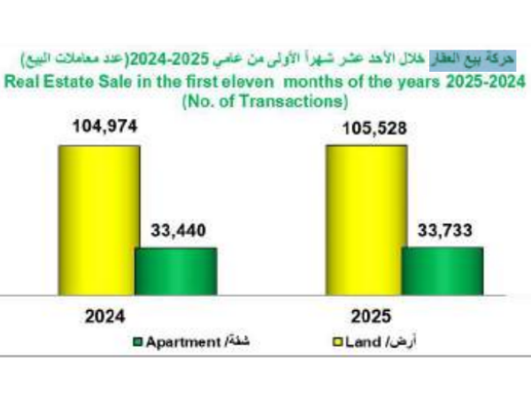 بينما كان عدد العقارات المباعة من شهر يناير حتى شهر تشرين الثاني ١٣٩,٢٦١ عقار، بزيادة عن عدد العقارات المباعة في عام 2024 التي كانت ١٣٨,٤١٤ عقار.