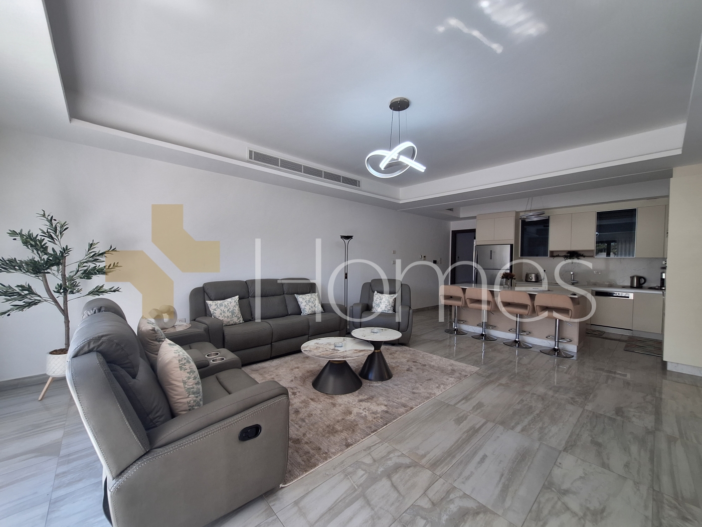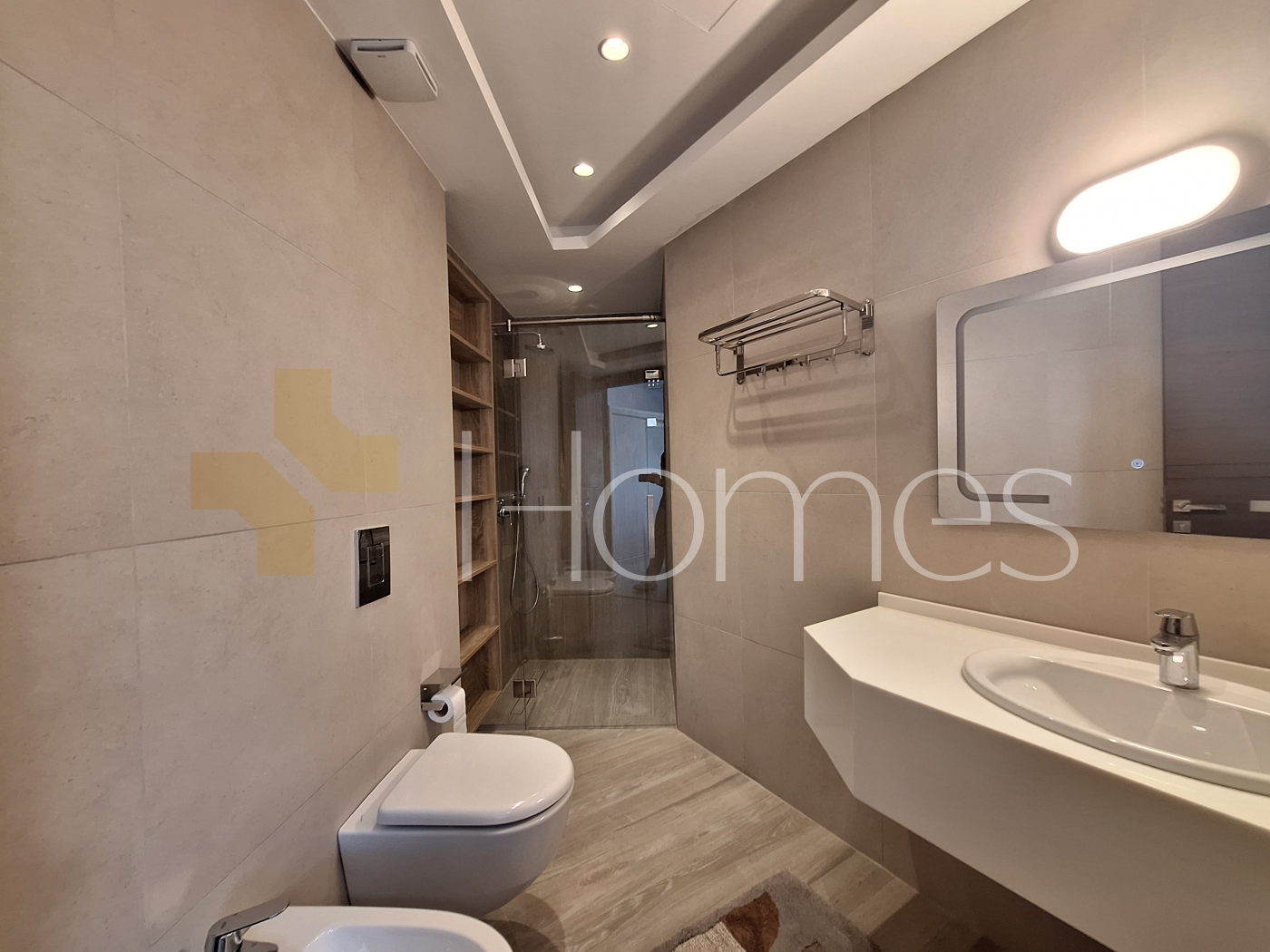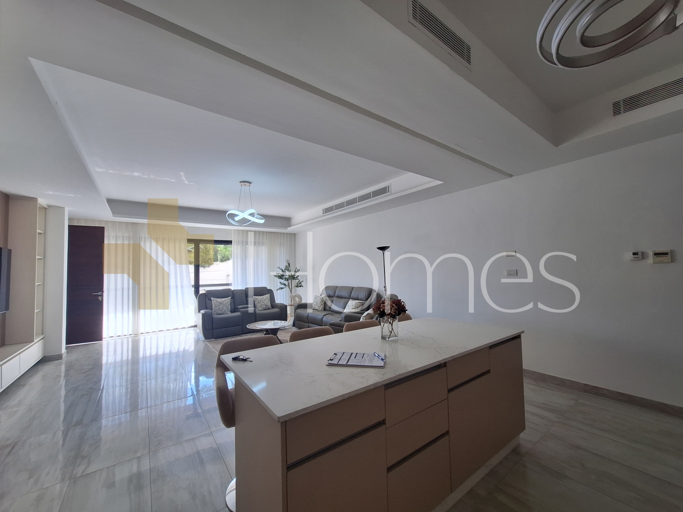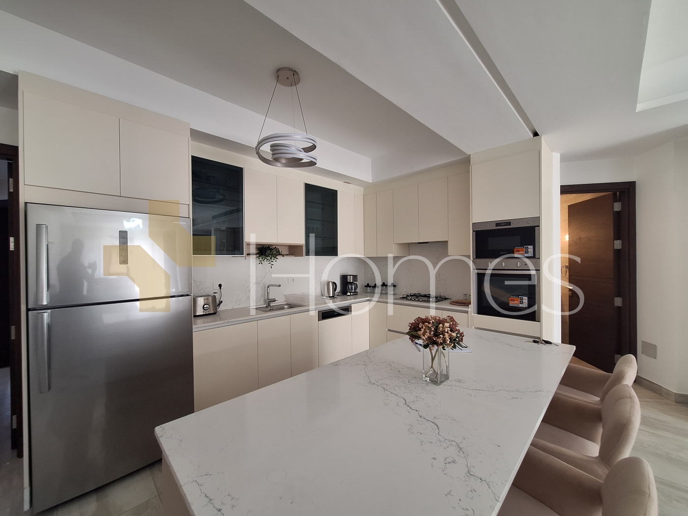 ارضيات رخام + سيراميك - تكييف مركزي - تدفئة تحت البلاط على الغاز - مطبخ راكب - خزائن - ديكورات جبصين + خشبية - حمامات معلقة - اباجورات كهربائية - شاور بوكس - مصعد - كاميرات مراقبة - انارة مخفية - زجاج دبل - تشطيبات سوبر ديلوكس