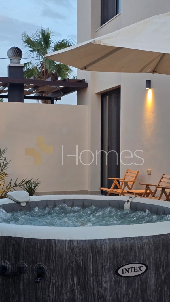 شاليه مفروش مع مسبح باطلالة عالية على البحر للبيع في البحر الميت، بمساحة ارض 813م، ومساحة بناء 220م
