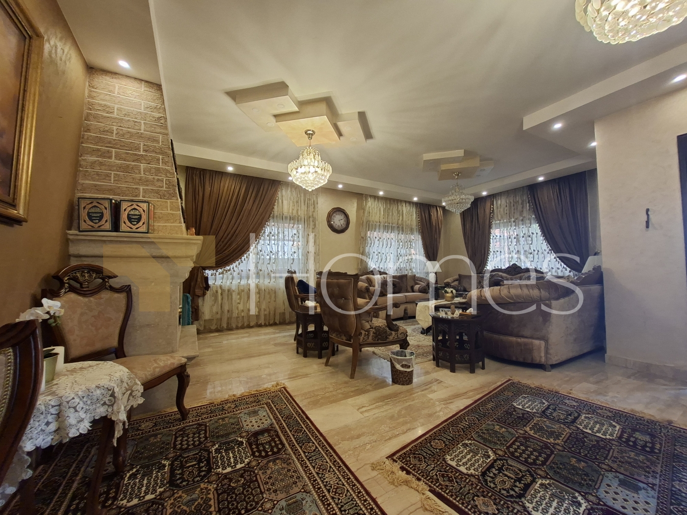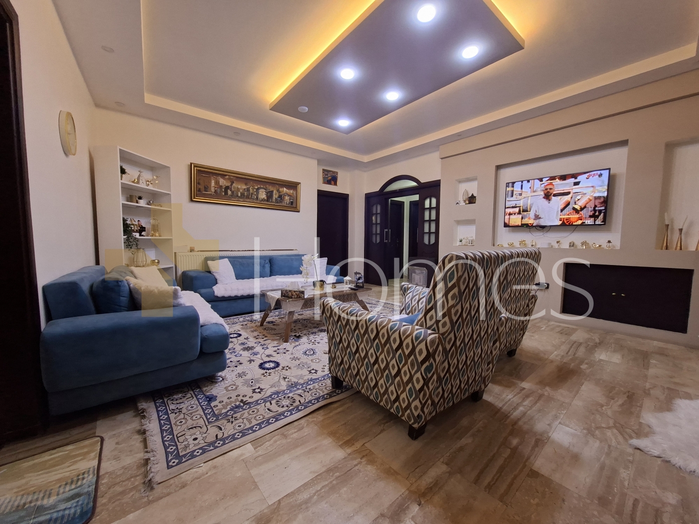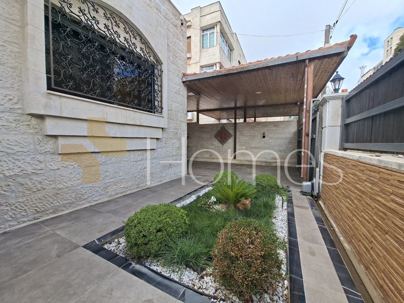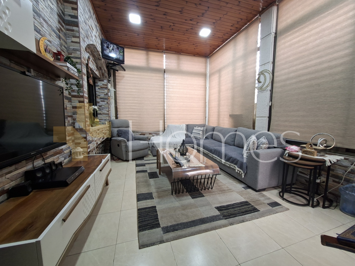ارضيات بورسلان - وحدات تكييف منفصلة - تدفئة - مطبخ راكب - خزائن بالحائط + عادية - ديكورات حجرية + خشبية - موقد - كاميرات مراقبة - انارة مخفية - تقع في حي راقي و هادئ