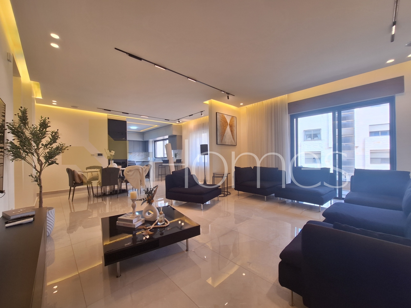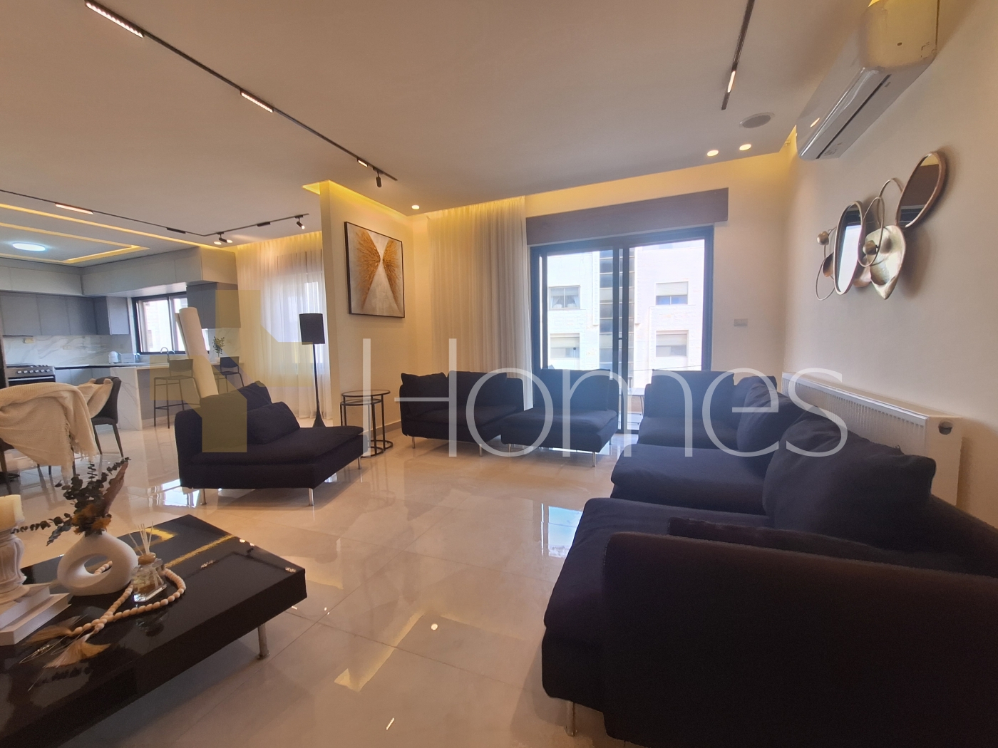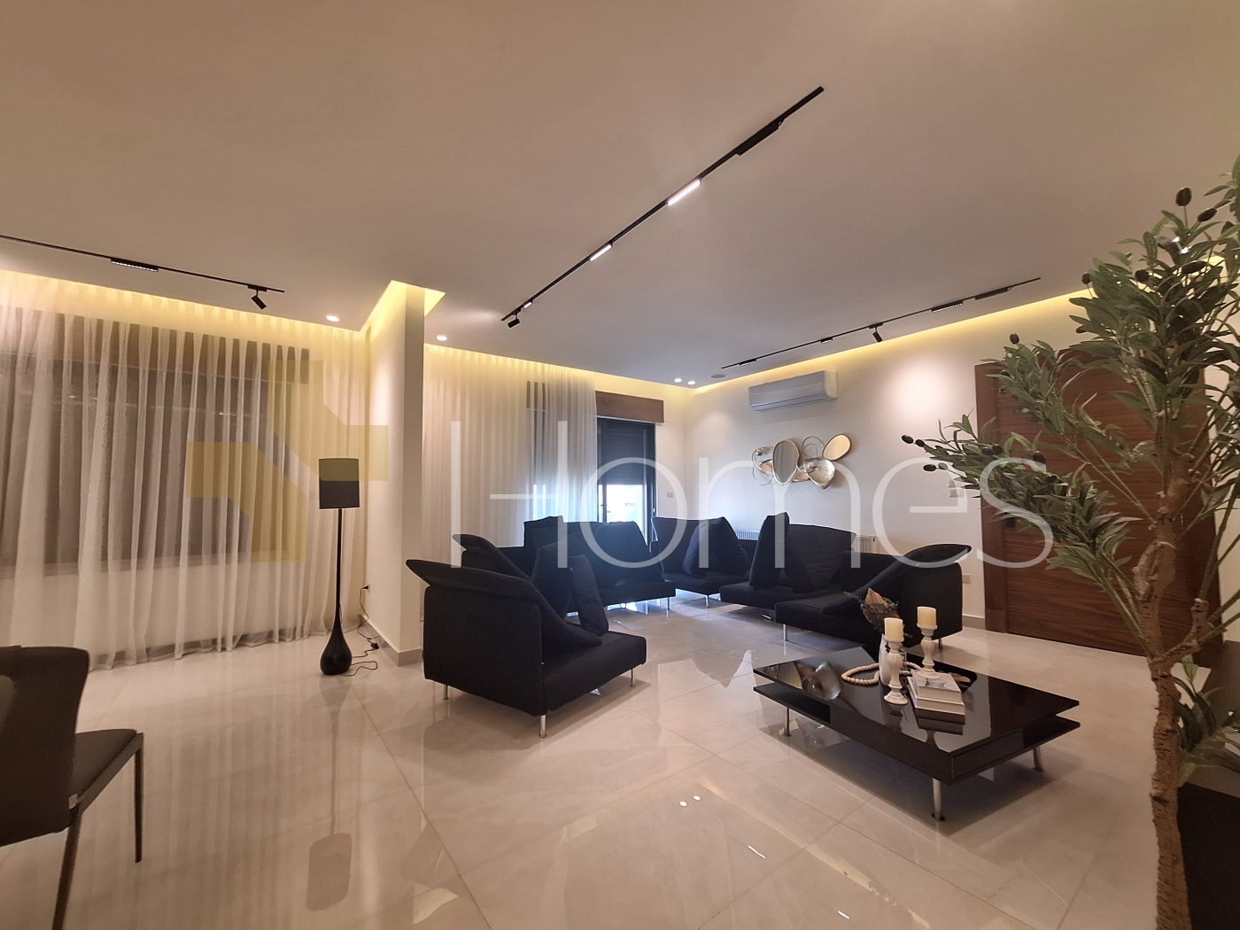 Porcelain floors - air conditioning units - heating - wardrobes - gypsum and wood decorations - security doors - concealed lighting - fireplace - elevator - double classes - stove - super deluxe finishing