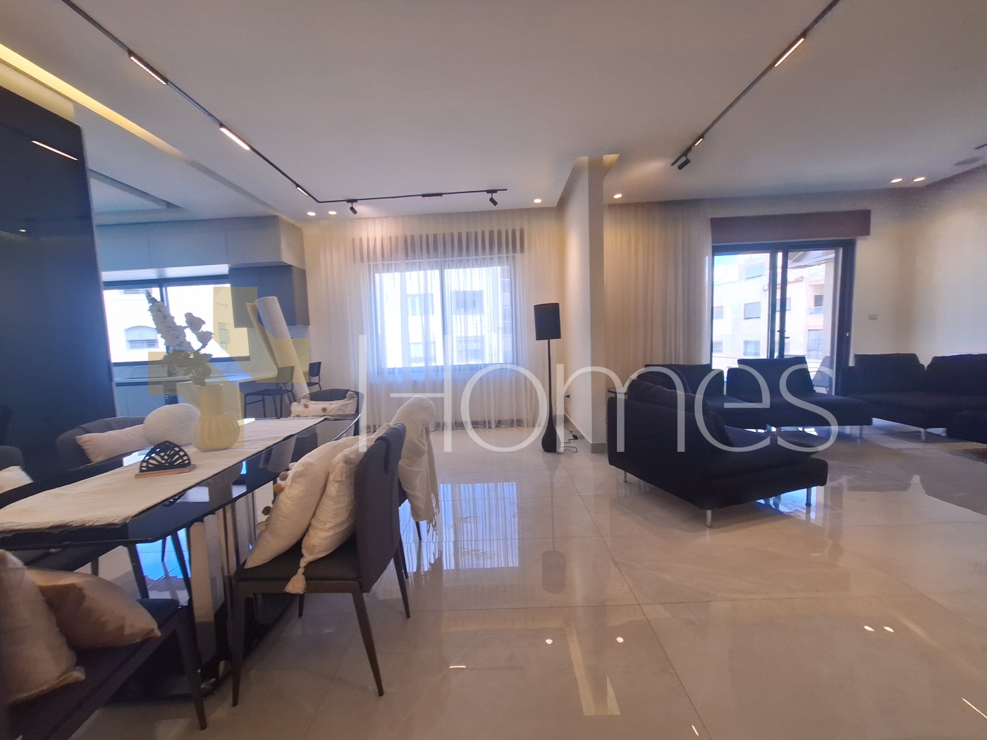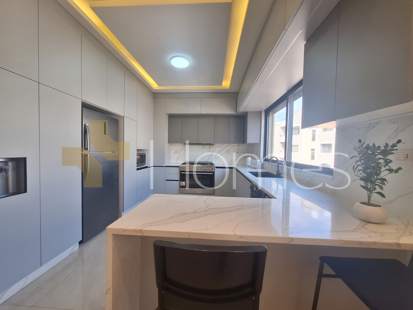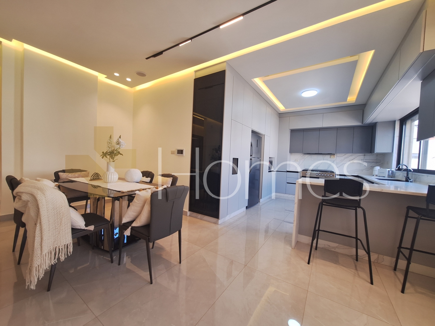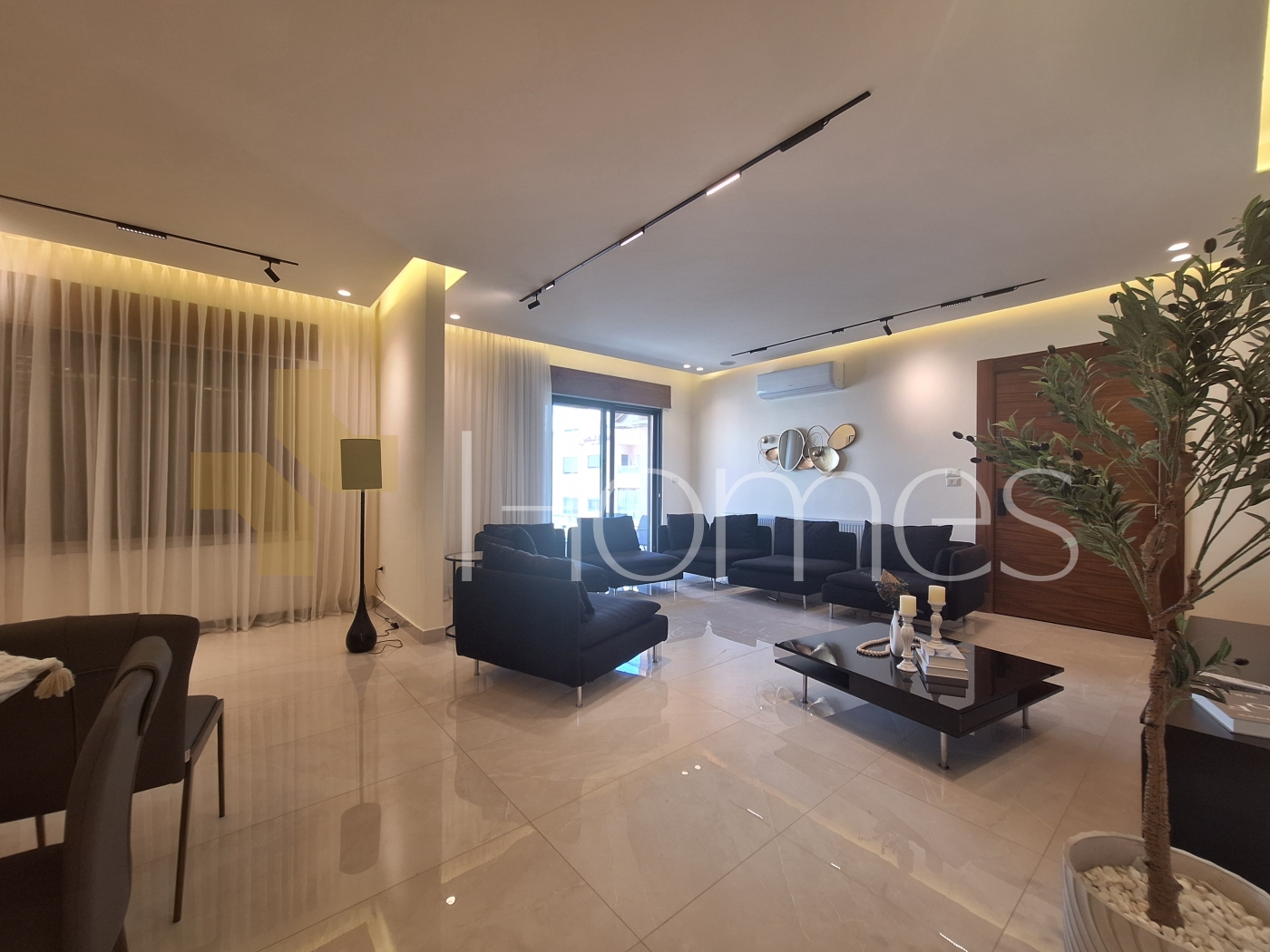 Porcelain floors - air conditioning units - heating - wardrobes - gypsum and wood decorations - security doors - concealed lighting - fireplace - elevator - double classes - stove - super deluxe finishing