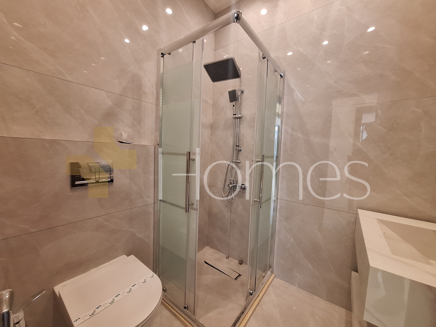 Porcelain flooring - air conditioning units - gas heating - gypsum, wood, and stone decorations - wall-hung toilets - electric window shutters - shower enclosure - elevator - security doors - recessed lighting - double classes - super deluxe finishing