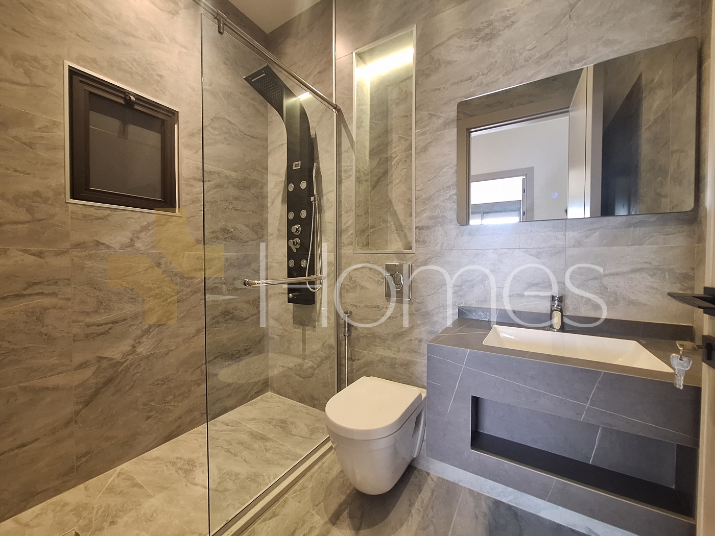 Porcelain Floors - Central Air Conditioning - Underfloor Heating - Double classes - Fireplace - Security Doors - Super Deluxe Finishes - Gypsum Decorations - Wall-Hung Toilets - Electric window shutters - Shower Enclosures - Elevator - Spotlights - Located in a Quiet Neighborhood