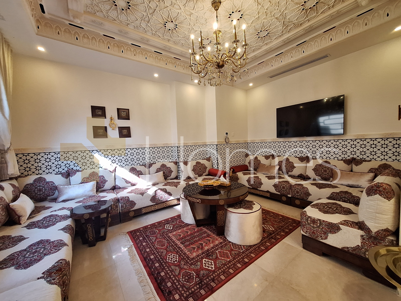 kitchen - porcelain floors + marble - central air conditioning - double-glazed built-in wardrobes - gypsum and wood decorations - shower enclosure - wall-hung toilets - electric window shutters - security doors - surveillance cameras - concealed lighting - water well - super deluxe finishes - located in a prestigious area