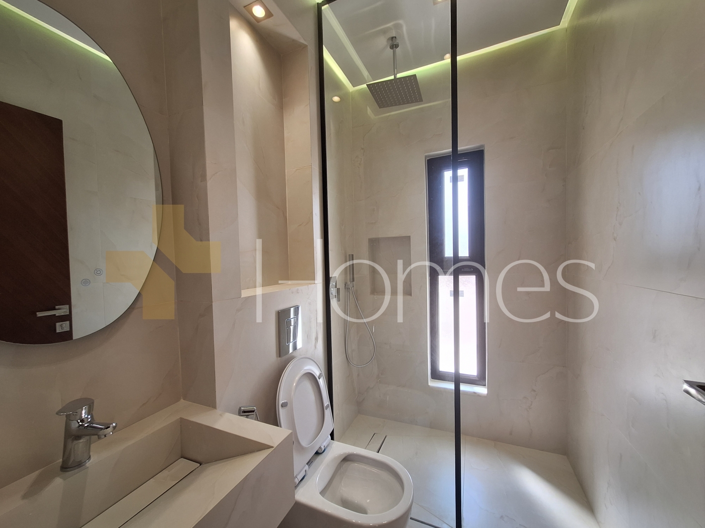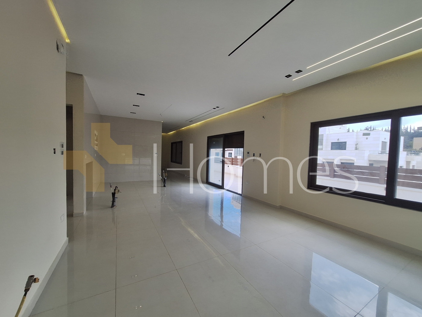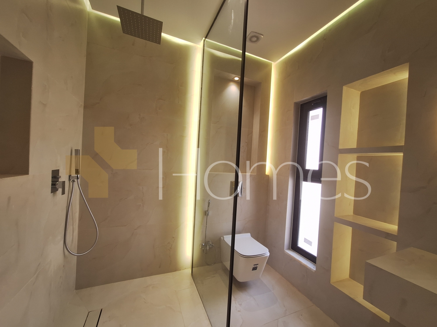 Porcelain floors - Air conditioning - Gas heating - Gypsum decorations - Suspended bathrooms - Electric window shutters - Shower boxes - Elevator - Security doors - Hidden lighting - Double classes .