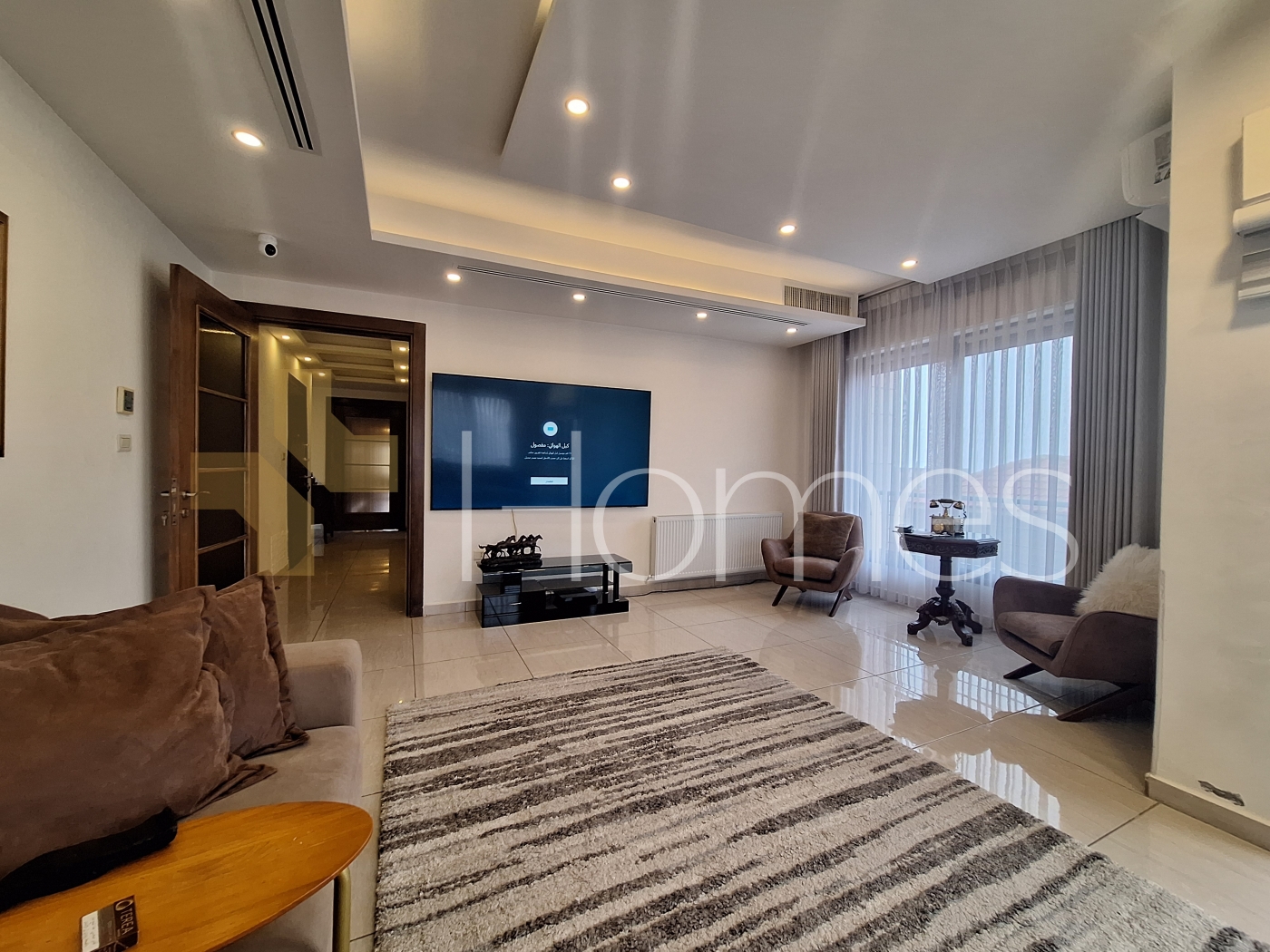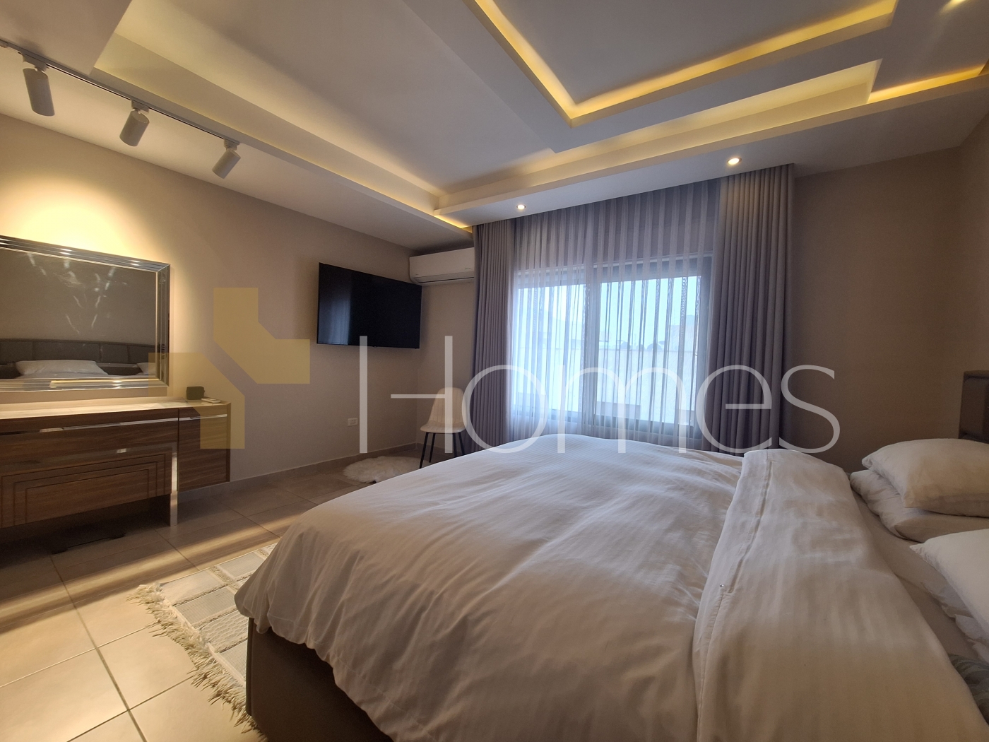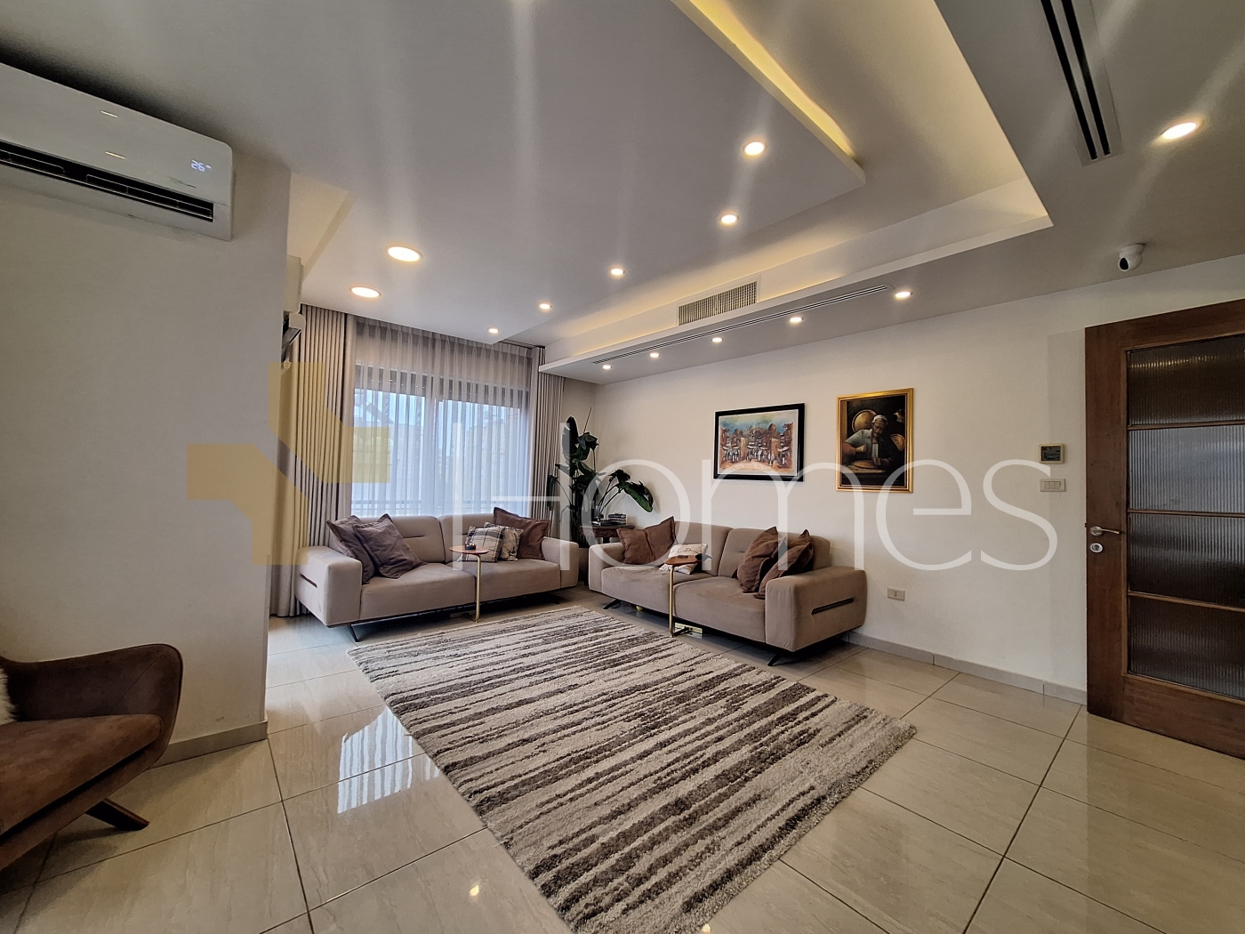 Porcelain tile floors - central air conditioning - heating - kitchen - built-in wardrobes - security doors - surveillance cameras - gypsum and wood decorations - wall-hung toilets - electric window shutters - shower enclosure - elevator - recessed lighting - double classes - super deluxe finishing