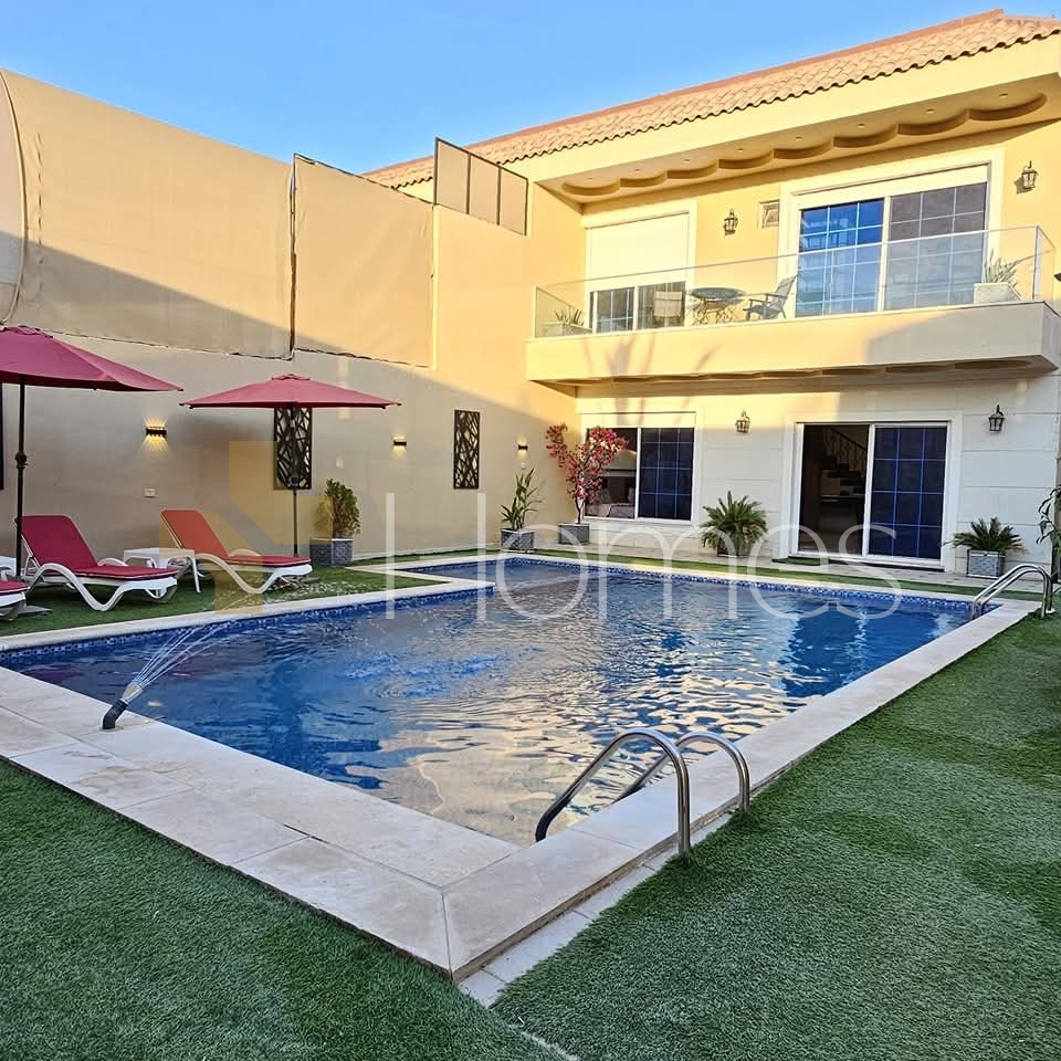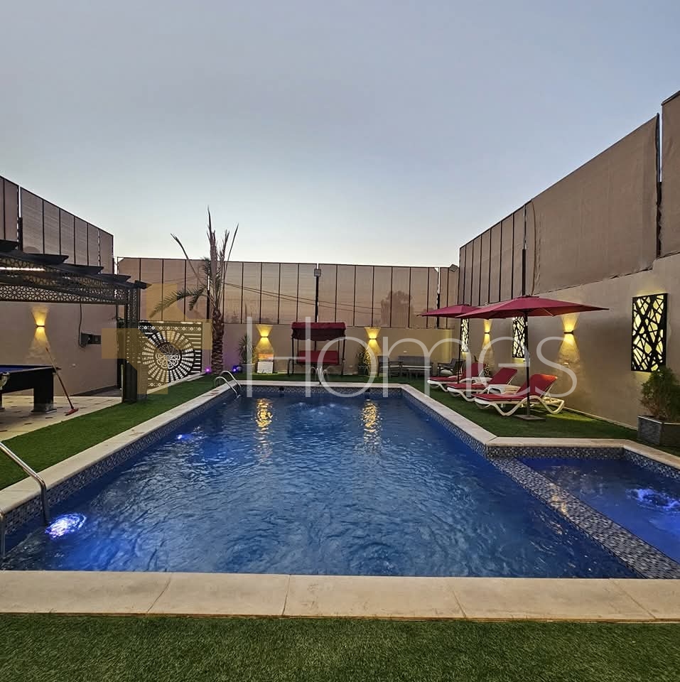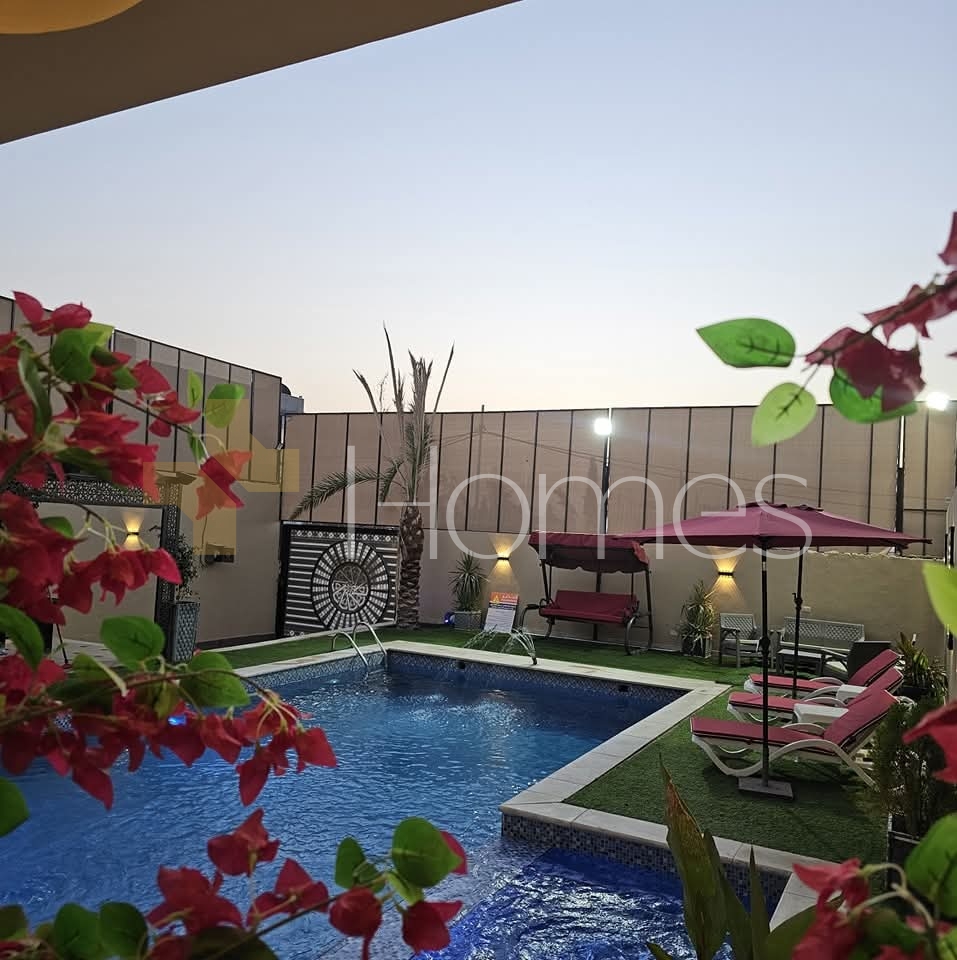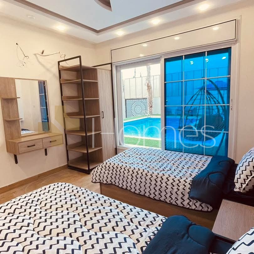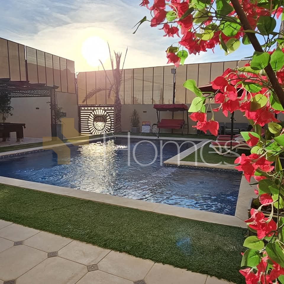 Furnished chalet with a swimming pool for sale in Al-Ghor, with a land area of 310m and a building area of 140m.
