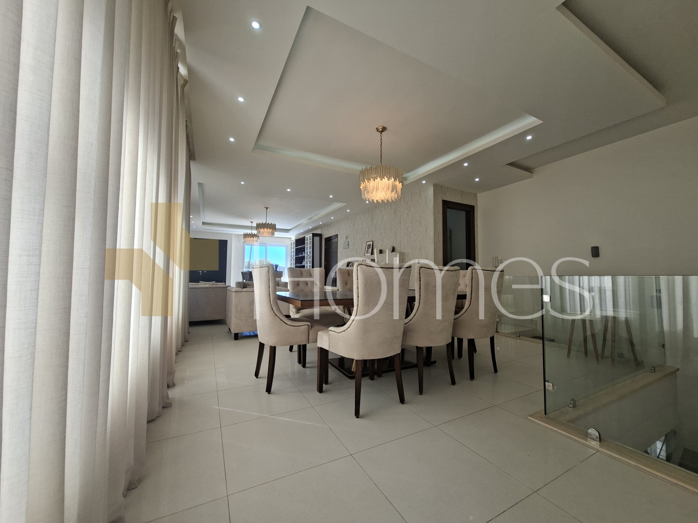 8 bedrooms (3 master) - 7 bathrooms - 3 living rooms - 3 kitchens - storage - maid's room + laundry room - 5 entrances - 2 terraces - 2 balconies - 2 garages (can accumulated for 2 cars).